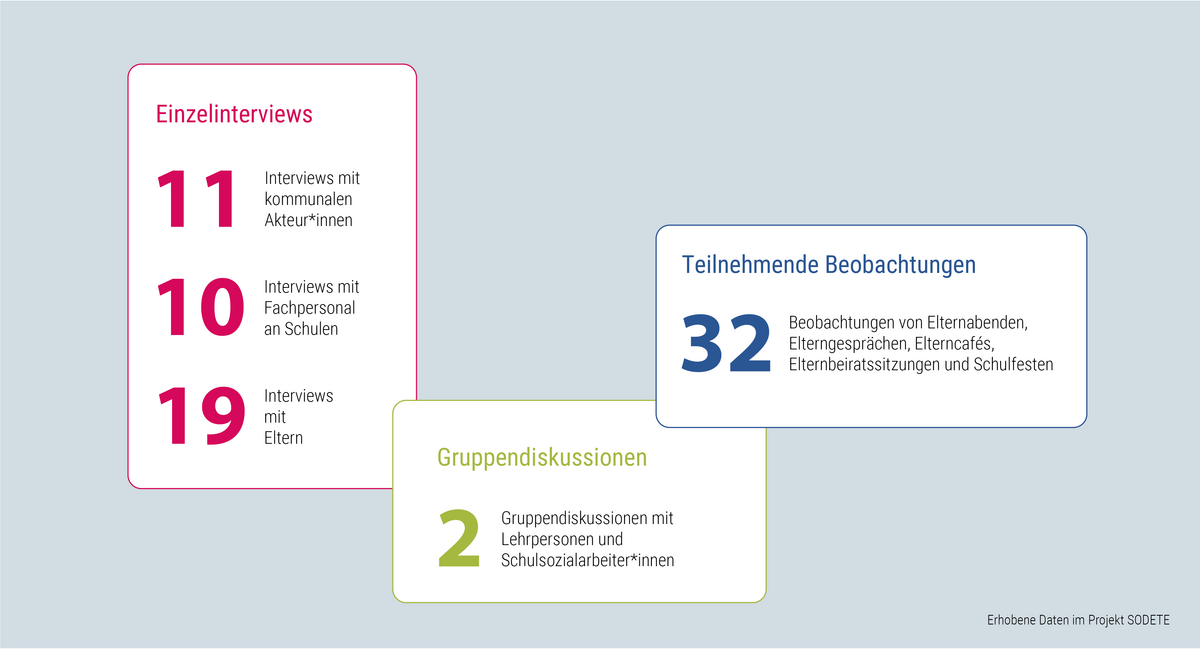 In der Forschungsphase wird ein Überblick über verschiedene Strategien der Beteiligung von Eltern an zwei exemplarisch ausgewählten Grundschulen gewonnen. Über teilnehmende Beobachtungen bei Schulveranstaltungen, Elternabenden, Elterncafés, Festen etc. sowie Einzel- und Gruppeninterviews mit Eltern und verschiedenen schulischen und kommunalen Akteur*innen, werden förderliche und hinderliche Faktoren der Elternbeteiligung analysiert. Die Beobachtungsprotokolle und Interviewtranskripte werden, orientiert am Vorgehen der Grounded Theory und der Situationsanalyse ausgewertet.